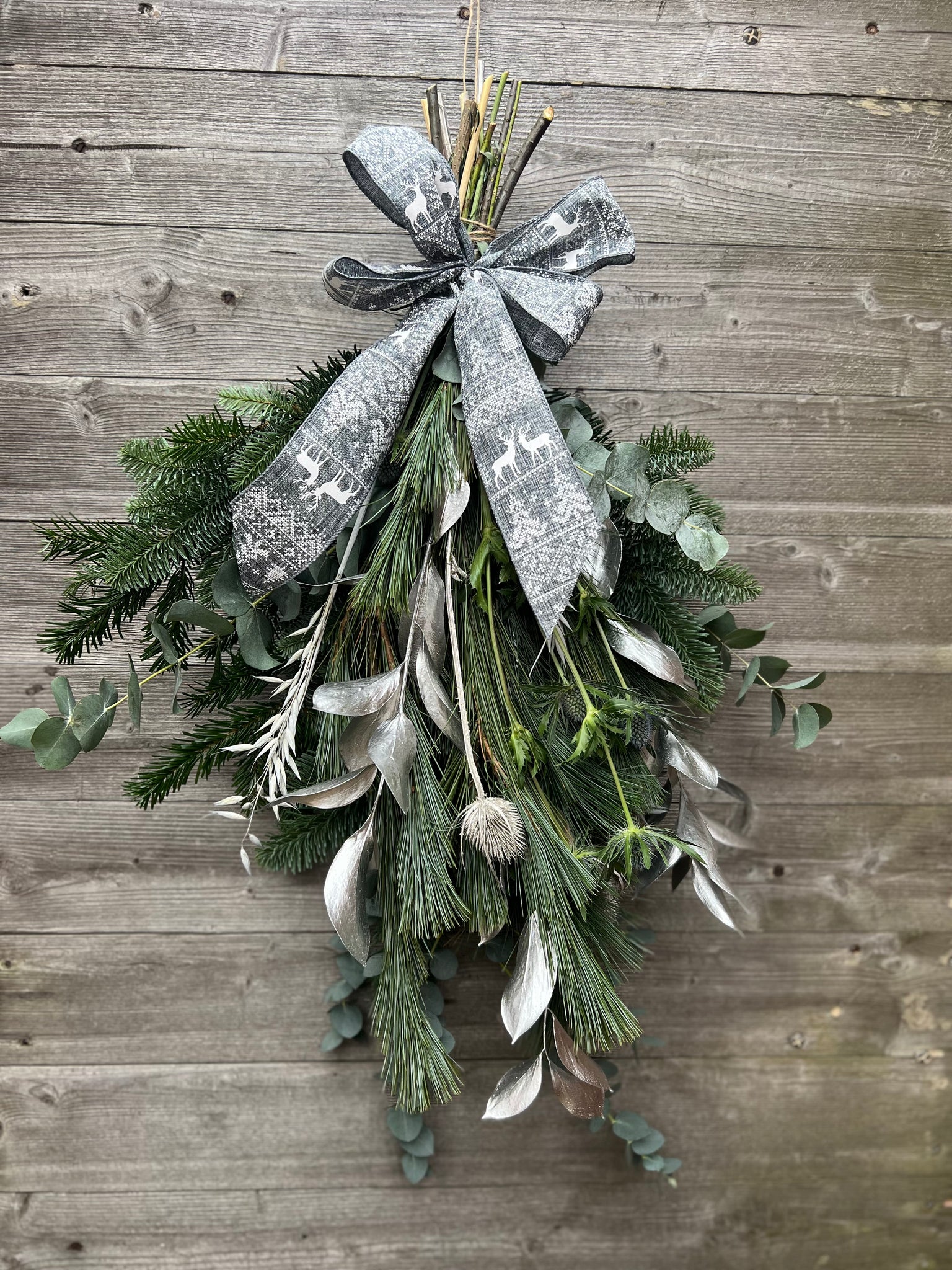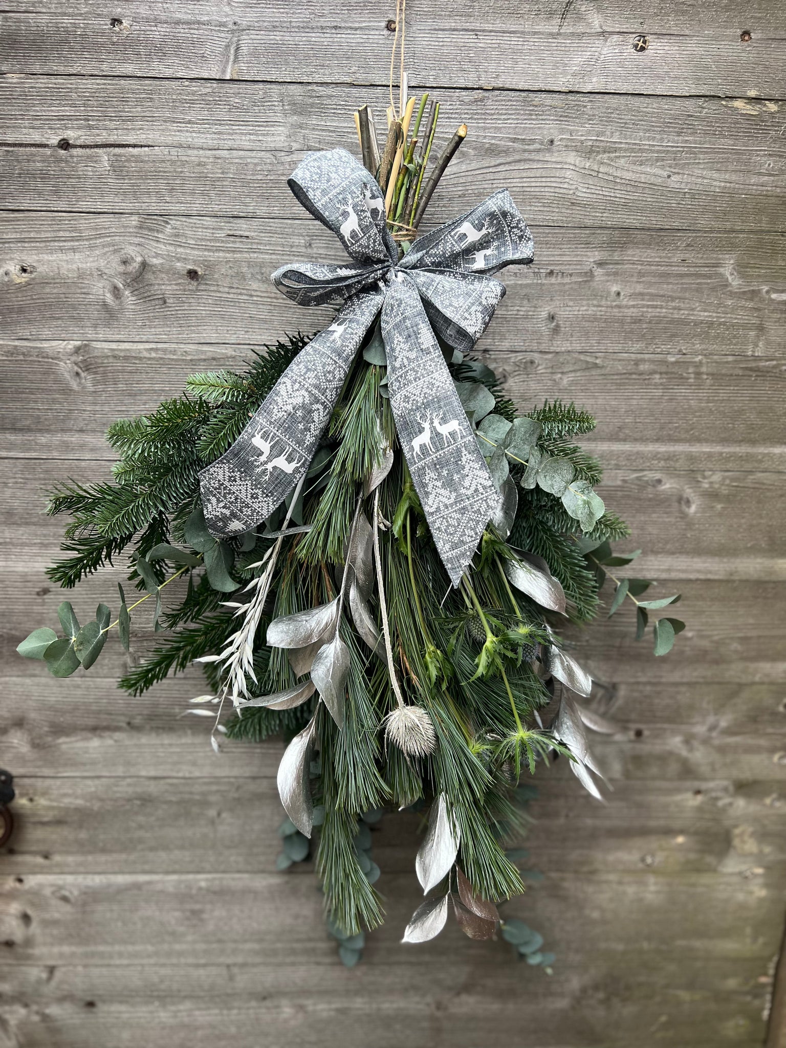A beautiful collection of festive foliages with added glitz to really add that festive sparkle. Tied with a beautiful bow - a gorgeous alternative to a wreath.