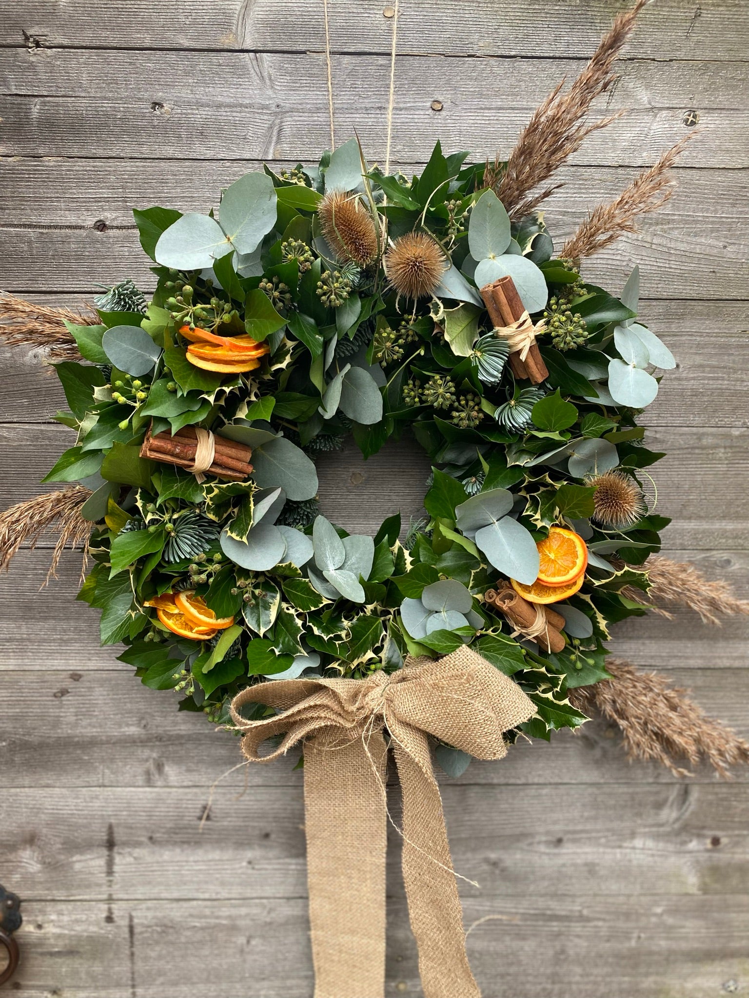 Mixed seasonal foliage’s finished with orange slices, pine cones, cinnamon and a large hessian bow.